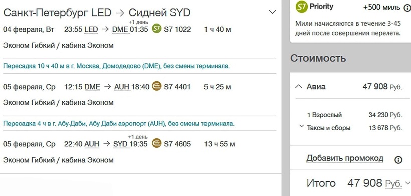 Если вам нужно лететь в бизнес-классе, то у S7 и Etihad его стоимость около 78 тысяч ₽. Покупка билетов в обе стороны поможет сэкономить примерно 10000 ₽. В целом предложение хорошее: удобное расписание, низкие цены для экономического или бизнес-класса. Хотя рейс выполняется двумя авиакомпаниями, но регистрация сквозная (до конечного пункта), за перемещение багажа между самолетами отвечает перевозчик.