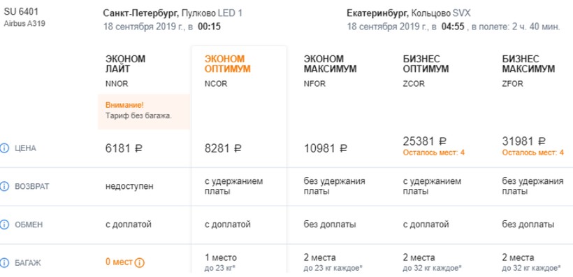 Кроме упомянутых авиаперевозчиков, ежедневно по одному прямому (ночному) авиарейсу из Петербурга в Екатиринбург выполняет лоукостер «Победа». И хотя по опыту я не могу назвать авиаперелеты с лоукостерами комфортными (самолеты маленькие, багаж, питание и выбор места на борту — за дополнительную плату), но для путешествия по маршруту часто отдаю предпочтение этой бюджетной авиакомпании, потому что она предлагает недорогие билеты. Полет только с ручной кладью в одну сторону обойдется в среднем в 4100–4600 ₽ (на редкие вылеты — в 5100–5600 ₽), туда-обратно — от 8200 ₽. За багаж нужно платить отдельно — по 1000 ₽ в одну сторону.