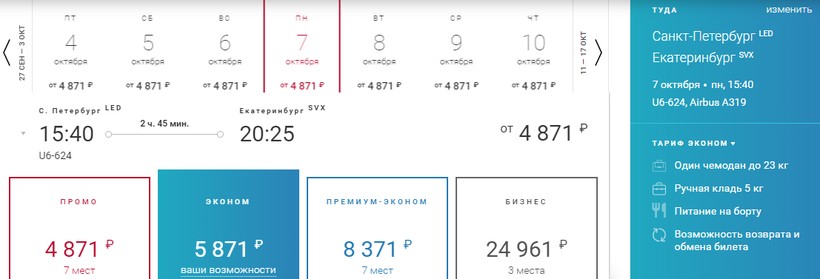 | Россия (FV 6403) Сухой Суперджет 100 | 18:05 Санкт-Петербург (LED) | 2 ч. 35 мин | 22:40 Екатеринбург (SVX) | 26, 29 сентября, 1 октября |