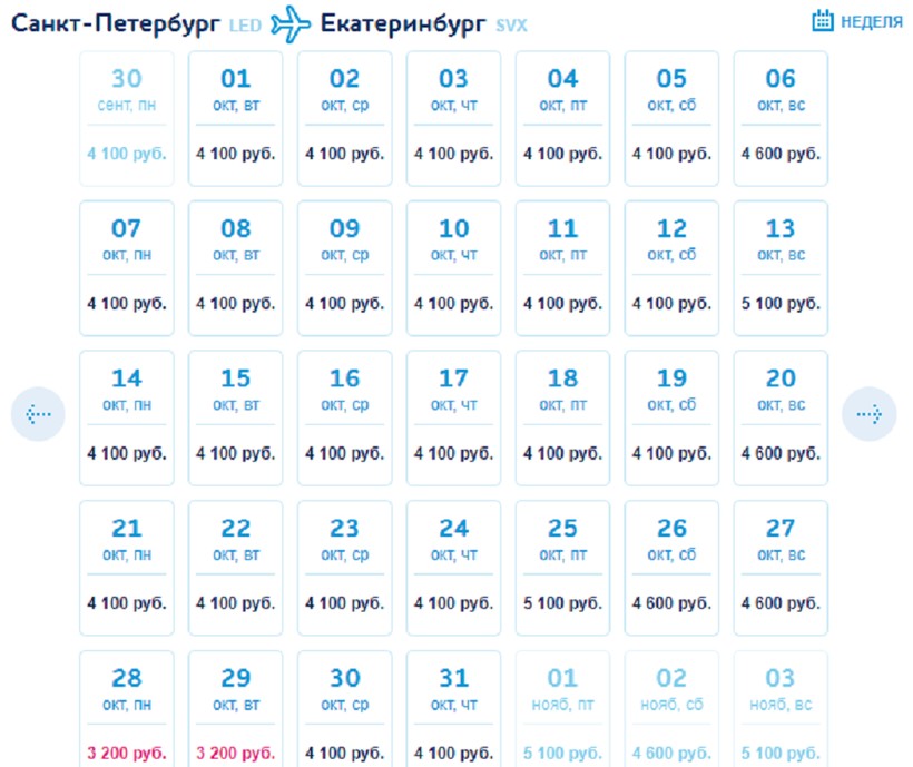 Билеты «туда-обратно» в феврале обойдутся вам всего в 7 693 рубля, а в сентябре придется заплатить за них не менее 32 664 рубля. В среднем же, долететь до Екатеринбурга и вернуться в Санкт-Петербург можно за 17 198 рублей.