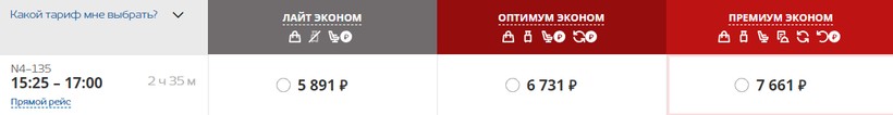 Предусмотрено 3 тарифа, «Лайт Эконом» — самый дешевый, но он без багажа. За перелет с багажом нужно заплатить на тысячу дороже («Оптимум Эконом»), если у вас много вещей, удобнее покупать его. Наибольшее количество опций в «Премиум Эконом», даже есть питание.