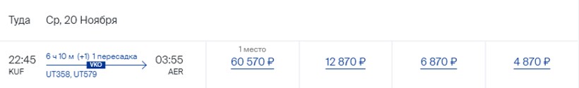 | Уральские авиалинии (U6 145) Airbus А320 | 09:30 Самара (KUF) | 3 ч. 10 мин | 11:40 Сочи (AER) | 4 ноября |