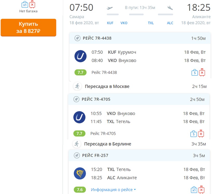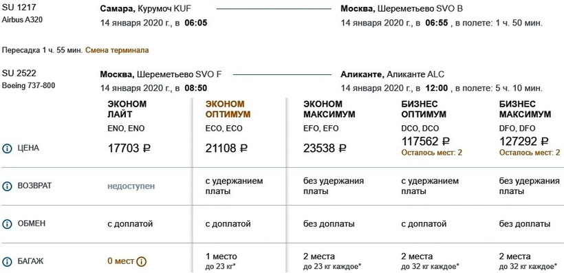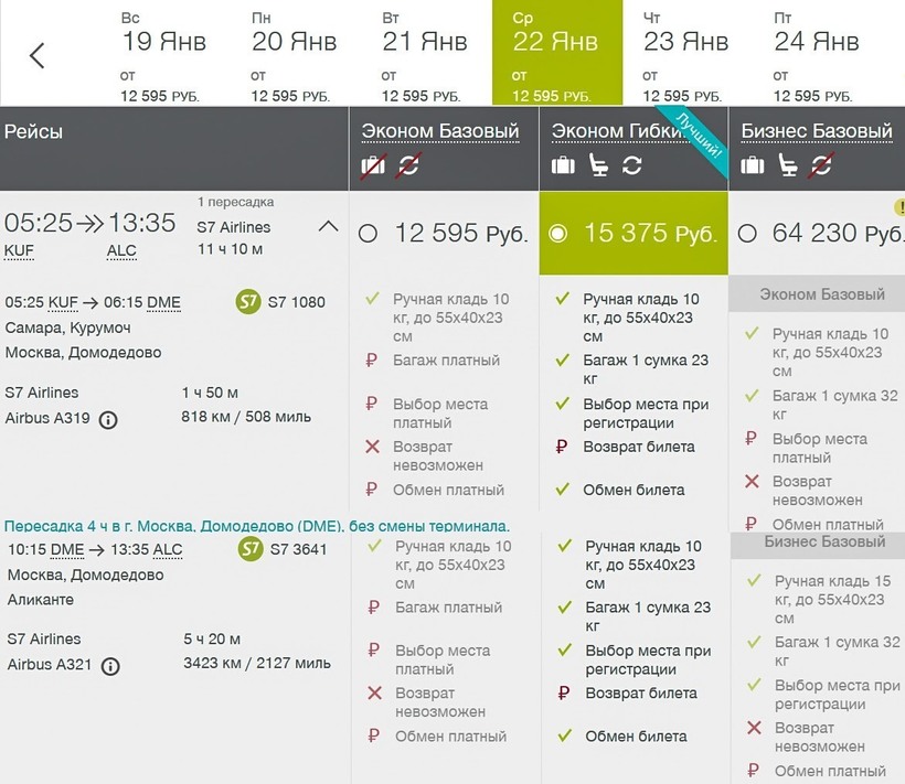 Главная причина, по которой я могу рекомендовать S7 в качестве перевозчика по маршруту — недорогие билеты (если сравнивать с «Аэрофлотом»). Перелет с багажом только туда стоит от 15500 ₽, если забронировать сразу и в обратную сторону — от 25500 ₽. Преодолеть весь путь в бизнес-классе с этой компанией не получится, потому что из Самары в Москву S7 предлагает полет только в классе эконом. А вот из российской столицы до Аликанте можно долететь в бизнес-классе, и обойдется такой вариант путешествия от 64500 ₽.