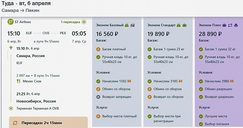 S7 Airlines проигрывает предыдущей российской авиакомпании по графику полетов, так как рейсы выполняет не ежедневно: в ноябре–апреле — только по вторникам, четвергам, субботам и воскресеньям, в мае–октябре самолеты летают еще и по понедельникам. Включая двухчасовую стыковку в Новосибирске, авиапутешествие длится 10 ч. Стоимость билетов с багажом у данного авиаоператора сопоставима с аэрофлотовскими ценами: туда полет обойдется от 20000 ₽, в обе стороны — от 38500 ₽. Бизнес-класс доступен из Новосибирска в Пекин, а на первом отрезке пути предлагается только экономкласс. Такой вариант авиаперелета стоит от 70500 ₽.