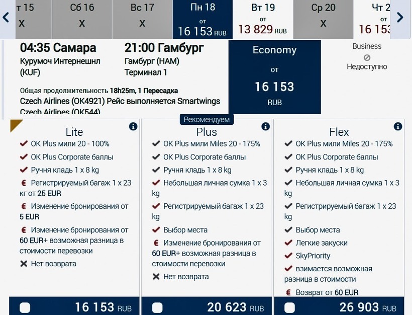 С мая по конец октября трижды в неделю (по понедельникам, вторникам и четвергам) преодолеть маршрут можно на крыльях Smartwings (выполняет рейсы совместно с «Чешскими авиалиниями»). Такой вариант авиаперелета, в первую очередь, рекомендую тем, кто хочет совместить полет в Гамбург с посещением Праги, потому что дневная пересадка в чешской столице занимает 13,5 часа (все путешествие длится 18,5 ч.). Во время стыковки могу посоветовать отправиться в Пражский Град или крепость Вышеград, а также обязательно посмотреть Старый город и прогуляться по Карловому мосту. По стоимости билетов чешский перевозчик уступают турецкому, но может составить конкуренцию российскому оператору: в среднем перелет с ручной кладью обойдется в 14000–16000 ₽, с багажом — 18500–20500 ₽. Покупать авиабилеты у Smartwings и в обратную сторону невыгодно — будут стоить от 28500 ₽ и 37500 ₽ соответственно. Цены актуальны на большинство вылетов сезона. Бизнес-класс компания не предлагает.