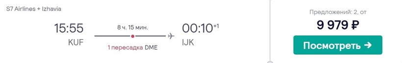 Прямые перелеты из Самары в Ижевск не предлагает ни один авиаперевозчик. Чтобы добраться до конечного пункта, нужно лететь транзитом, например, с S7 и «Ижавиа». Авиаоператоры доставят до места назначения за 8,5 ч.