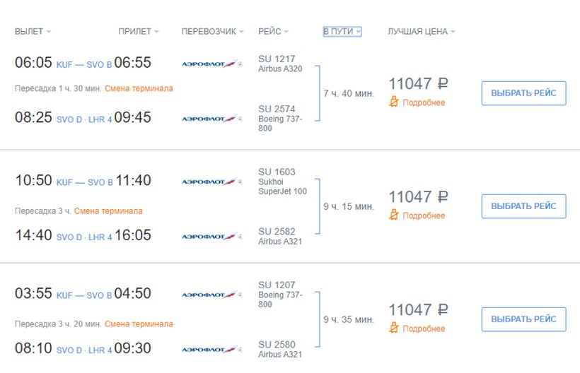 Минимальная продолжительность перелета составит 7,5 часа, полтора из которых займет стыковка в Шереметьево. Не бойтесь, что вам не хватит времени — регистрироваться и заново проходить досмотры нет необходимости, от вас потребуется только перейти из одного терминала в другой. И даже если вы опоздаете на рейс, компания либо вернет вам деньги, либо пересадит на ближайший лайнер до Лондона. «Аэрофлот», в отличие от S7, допускает возможность путешествия без багажа. Купить билеты можно за 11000 рублей (минимальный тариф, куда включена только ручная кладь). Если же вам нужно взять с собой вещи, то готовьтесь заплатить 14000 рублей. Давно заметила, что у этого перевозчика выгоднее оплачивать полет сразу туда и в обратном направлении, я так всегда экономлю пару тысяч рублей, когда летаю с ним. Вот и путешествие из Самары до Лондона и назад будет стоить 18000 рублей.