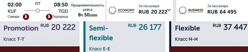 Назвать авиасообщение между Самарой и столицей Черногории очень развитым не могу — прямые рейсы по направлению не выполняются, а преодолеть путь с одной пересадкой получится только с авиакомпанией Turkish Airlines. Самолеты турецкого оператора с апреля по конец октября летают по понедельникам, средам, четвергам и субботам, в остальные месяцы — по понедельникам, вторникам, четвергам и субботам. Рейс ночной. С полуторачасовой или трехчасовой пересадкой в Стамбуле авиапутешествие занимает 7,5–9 ч. Билеты у «Турецких авиалиний» довольно дорогие: в одну сторону обойдутся от 20200 ₽, туда-обратно — от 32500 ₽. К плюсам могу отнести то, что в эту минимальную стоимость уже включен провоз багажа весом до 30 кг. С другой стороны, путешественникам, привыкшим летать налегке, сэкономить не удастся. Авиаперелет в бизнес-классе стоит от 64500 ₽.