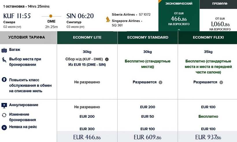 Самолеты S7 и Singapore Airlines летают по маршруту во все дни недели, за исключением среды и воскресенья. Авиарейсы выполняются через Домодедово, со стыковкой длительностью 1,5–2,5 ч. путешествие занимает 13,5–14,5 ч. Перелет с данными компаниями назвать дешевым не могу: только туда обойдется от 36500 ₽ (467 €), если приобрести авиабилет сразу и в обратную сторону, стоимость составит от 51500 ₽ (660 €). Бизнес-класс — от 167500 ₽ (1240 €). В цену полета в экономклассе уже включен чемодан багажа до 30 кг.