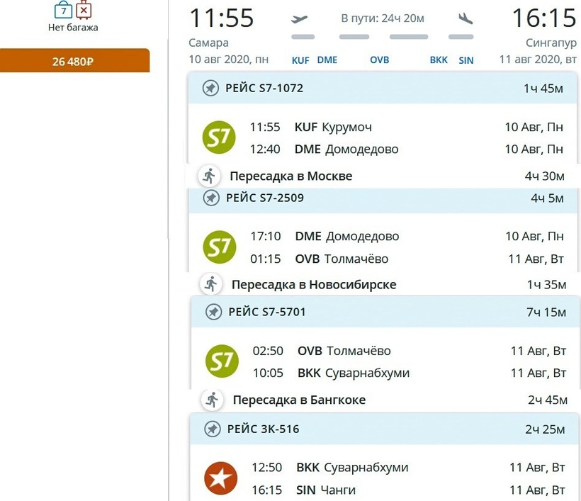 В весенне-летнее время, когда на рейсы с одной пересадкой билеты довольно дорогие, любителям бюджетных путешествий налегке могу порекомендовать транзитные авиаперелеты с S7 и Jetstar Asia. С тремя пересадками (в Москве, Новосибирске и Бангкоке) полет займет 24,5 часа и обойдется с ручной кладью только туда от 26500 ₽.