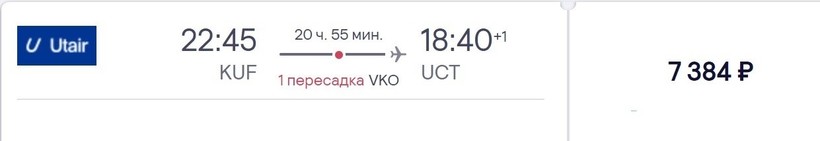 В город Ухта, расположенный в центральной части республики Коми из Самары можно попасть только транзитом — прямое авиасообщение не налажено. Потратив на дорогу 21 час, до места назначения можно добраться, заплатив за билеты минимум 7400 рублей. Цена актуальна за неделю до вылета и более. Исключением являются популярные даты, например, Новый год, майские праздники и т. д. — тогда авиаперевозчик (а/к «ЮТэйр») стабильно поднимает цены минимум на 10 %. Стыковка в московском аэропорту Внуково длительная — около 18 часов. Вариант подойдет тем, у кого есть дела в столице. До города и в обратную сторону можно доехать на комфортабельных аэроэкспрессах, автобусах, такси.
