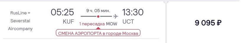 Более быстрый вариант авиапутешествия в Ухту — перелет с авиакомпаниями «РусЛайн» и «Северсталь». В конечном пункте окажетесь через 9 часов. Пересадка также будет в столице РФ. Она самостоятельная, со сменой воздушной гавани. Первый рейс выполняет «РусЛайн», и приземлится самолет авиаоператора во Внуково. Далее вам нужно доехать до аэропорта Шереметьево, откуда будет выполняться заключительный рейс в Ухту с а/к «Северсталь». Так как времени на пересадку отводится немного (5,5 ч.), то из одного авиаузла в другой рекомендую добираться на такси. Стоимость перелета только туда — от 9100 рублей. Авиабилеты за такую цену можете купить за неделю и более.