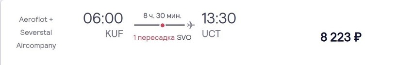 Чтобы избежать смены аэропорта в Москве или длительной стыковки, можете рассмотреть вариант авиапутешествия с а/к «Аэрофлот» и «Северсталь». Это один из самых оперативных способов долететь до Ухты из Самары. Время в пути — 8,5 ч. На стыковку в аэропорту Шереметьево выделяется 4,5 ч. У авиакомпаний нет договоренности о пересадке. Вам придется забрать багаж (при его наличии), заново пройти предполетные процедуры. Стоимость авиаперелета в один конец — от 8200 рублей (за неделю).