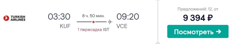 Начну с того, что прямые рейсы из Самары в Венецию не выполняются, советую добираться стыковочными. Расскажу про самые популярные варианты перелетов с пересадкой. За девять часов добраться до этого итальянского города можно с самой крупной авиакомпанией Турции — Turkish Airlines. На стыковку из этого времени уйдет два часа с небольшим, она будет в Новом аэропорту Стамбула. Багаж можете сразу зарегистрировать в аэропорту вылета (Кумуроч) до конечного пункта. Стоимость билетов только туда за пару недель до вылета от 9400 рублей. Этот вариант перелета доступен три раза в неделю. Перевозчик предлагает как экономкласс, так и бизнес.