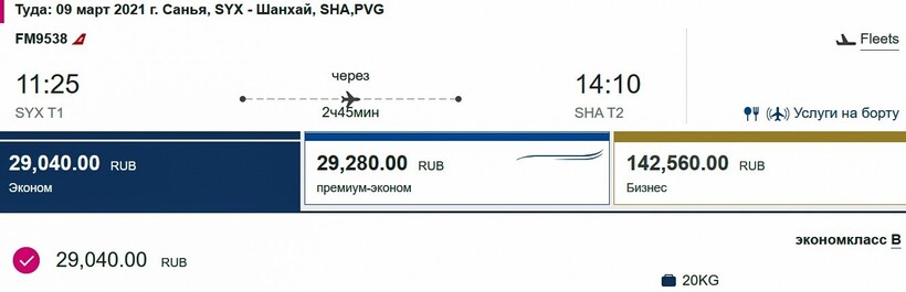 China Eastern хотя и несущественно, но проигрывает вышеописанному перевозчику в расписании авиарейсов, так как лайнеры летают всего по два раза в день. По цене авиабилетов в одну сторону данный оператор уступает предыдущему — перелет с багажом стоит примерно от 32000 ₽. Зато если бронировать места сразу и на обратную дорогу, авиапутешествие обойдется от 45000 ₽. Бизнес-класс — от 154500 ₽.