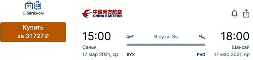| China Eastern Airlines (MU 5468) Airbus А320 | 17:30 Санья (SYX) | 3 ч. 30 мин | 21:00 Шанхай (PVG) | пт с 03.04 |