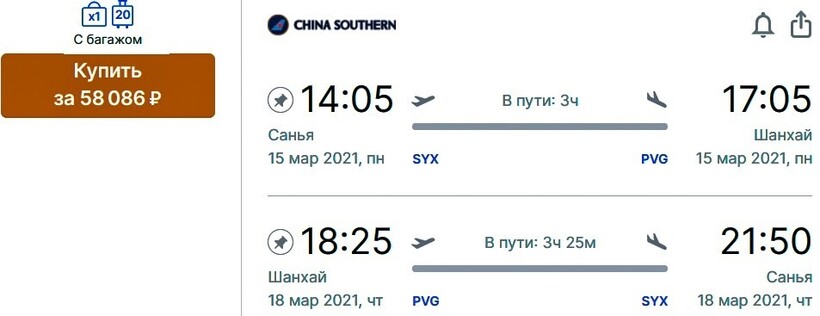 | China Southern Airlines (CZ 3835) Airbus А321 | 12:00 Санья (SYX) | 3 ч. 30 мин | 15:30 Шанхай (PVG) | 20 октября |
