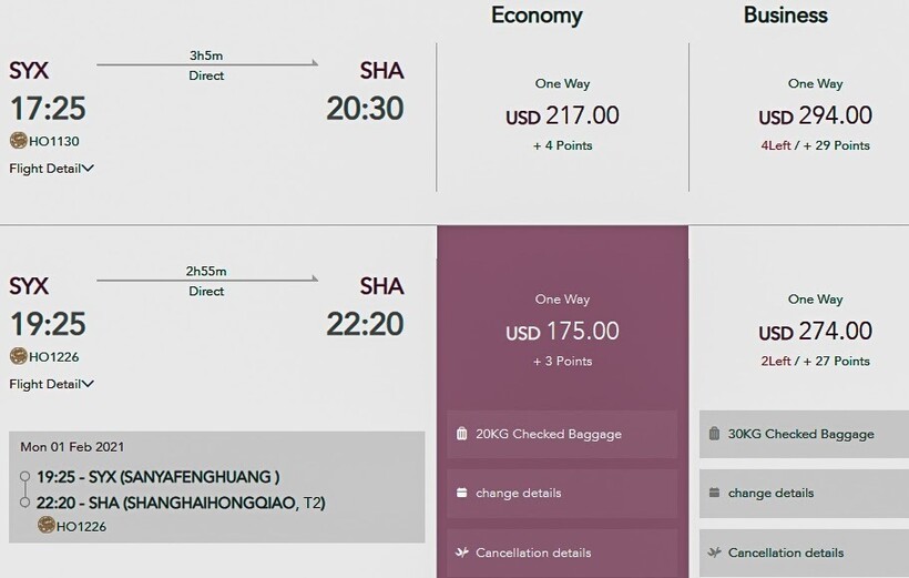 С Juneyao можно преодолеть путь каждый день (вылеты дневные и вечерние — всего 4). Авиаперелеты с данным оператором также из недорогих: туда обойдутся от 13500 ₽ (175 $), туда-обратно — от 26500 ₽ (350 $). Цены включают провоз 20 кг багажа, и, в отличие от предыдущего лоукостера, тариф с ручной кладью у этого перевозчика не предлагается. Зато у Juneyao доступен бизнес-класс, авиабилет в который стоит от 21000 ₽ (274 $).