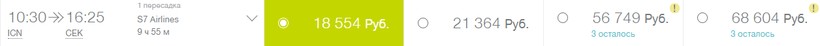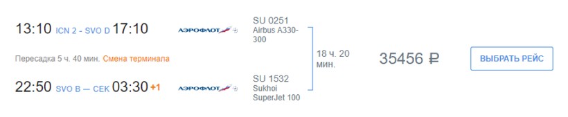 Я предпочитаю данную авиакомпанию, потому что у нее самое удобное расписание. У перевозчика предусмотрено несколько вылетов в день, однако самый удобный тот, что вылетает из сеульского аэропорта Инчхон днем. Продолжительность стыковки в московском Шереметьево — 6 часов, а весь полет продлится 18 часов.