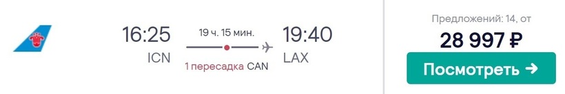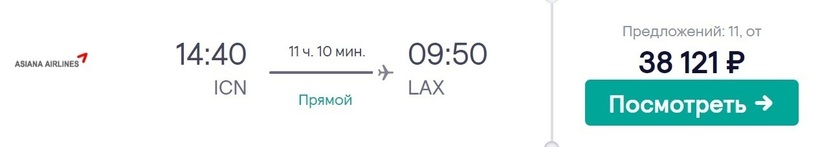 Между столицей Южной Кореи и Лос-Анджелесом есть прямое авиасообщение. Его обеспечивают два перевозчика: Asiana Airlines и Korean Air. Полетное время у обеих а/к составляет 11 часов. Asiana Airlines является членом Star Alliance (глобальный альянс пассажирских авиаперевозок) и выполняет один ежедневный рейс в этот американский город. Время отправления лайнера разное — днем, вечером (расписание нестабильное). Билет за пару недель до вылета только туда купите за 38100 рублей.