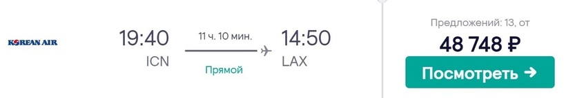 | Korean Air (KE 17) Boeing 747-8i | 14:30 Сеул (ICN) | 11 ч. 10 мин | 09:40 Лос-Анджелес (LAX) | ежедневно с 29.03 по 30.06 |