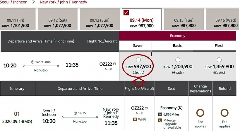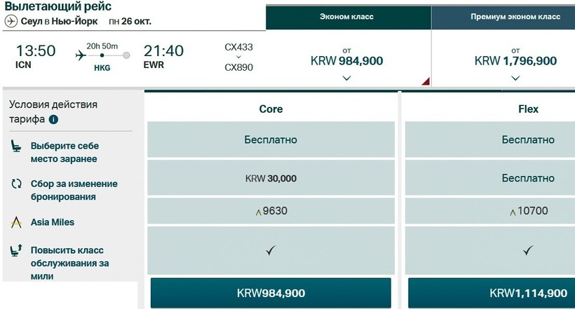 Asiana Airlines (OZ 222) Airbus A350-900 | 09:00 Сеул (ICN) | 14 ч. 15 мин | 10:15 Нью-Йорк (JFK) | 19, 20, 21, 22, 23, 24, 25, 26, 27, 28, 29, 30 сентября, 1, 2, 4, 5, 6, 7, 9, 11 октября, … |