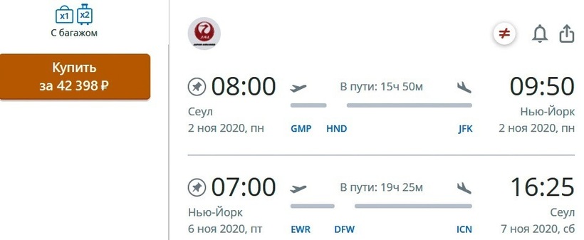 С JAL можно улететь по маршруту ежедневно утром и днем. Включая стыковку в Токио продолжительностью 1–4,5 ч., путешествие занимает 16–19,5 ч. Минус такого варианта перелета в том, что для него дополнительно потребуется транзитная японская виза. В одну сторону авиабилеты с багажом у JAL можно купить за 51000 ₽ (840000 KRW), туда-обратно обойдутся всего от 42500 ₽. Бизнес-класс — от 232000 ₽.