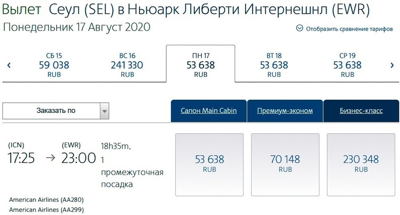 Самый быстрый вариант полета по направлению — беспересадочный (занимает 14 ч.). Из прямых перевозчиков советую выбрать путешествие с компанией Asiana Airlines, у которой авиабилеты дешевле на 5500–35500 ₽, чем у Korean Air. Я преодолевала маршрут транзитом с American Airlines, потому что цена билетов у этого авиаоператора была ниже минимум на 17000 ₽, чем у прямых перевозчиков, и на 4000 ₽, чем у Cathay Pacific.