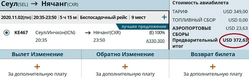 Korean Air также совершает по одному ежедневному авиаперелету, но, в отличие от вьетнамского оператора, лайнеры летают поздно вечером, что не очень удобно. К недостаткам данной авиакомпании могу отнести и высокую стоимость билетов: в одну сторону обойдутся от 27500 ₽ (373 $), туда-обратно — от 46000 ₽ (622 $). Удешевить полет за счет багажа не удастся, так как провоз чемодана весом 23 кг уже включен в минимальные тарифы. Бизнес-класс — от 77500 ₽ (1055 $).
