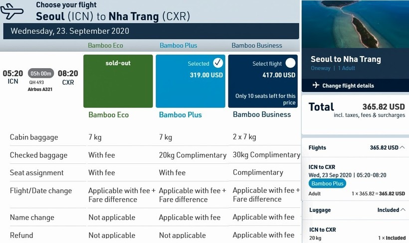 Bamboo Airways выполняет по направлению ежедневные утренние авиарейсы. Несмотря на то, что Bamboo является лоукостером, авиаперелет с ним дорогой: на большинство вылетов в году (в том числе и в период новогодних праздников) билеты с багажом (до 20 кг) туда стоят от 27000 ₽ (365 $), в обе стороны — от 53500 ₽ (725 $). Тариф с ручной кладью по маршруту у оператора недоступен. Бизнес-класс — от 34500 ₽ (465 $).