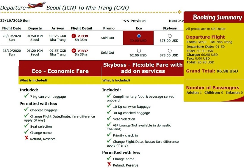 VietJet Air уступает всем вышеописанным авиакомпаниям в расписании рейсов: самолеты этого лоукостера летают только с конца октября по январь дважды в сутки — ночью и утром. Билеты у перевозчика с ручной кладью недорогие: туда стоят от 7000 ₽ (97 $), если забронировать места и в обратном направлении, это обойдется от 14500 ₽ (195 $). Доплата за провоз багажа весом до 20 кг составляет около 1000 ₽ (14 $). Полет в бизнес-классе VietJet не предлагает.