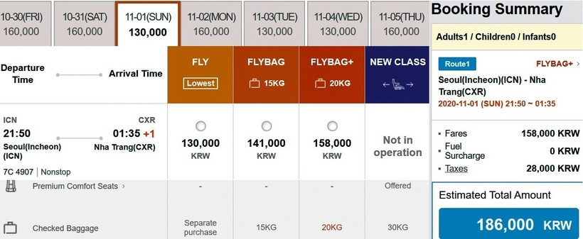 Прямой перелет по маршруту занимает 5 часов. Учитывая довольно развитое беспересадочное сообщение, лететь транзитом нецелесообразно. Самые дешевые авиабилеты по направлению предлагает лоукостер VietJet, цены у которого ниже на 3500–37000 ₽, чем у других прямых перевозчиков. Но мне необходимо было преодолеть маршрут в период, когда данная компания рейсы не выполняла (напомню, самолеты летают только в ноябре–декабре), поэтому я выбрала полет с бюджетным авиаоператором Jeju, у которого билеты туда-обратно стоили дешевле на 1500 ₽, чем у «Вьетнамских авиалиний», на 26000 ₽, чем у Korean Air, на 33500 ₽, чем у Bamboo. Самый недорогой авиаперелет в бизнес-классе предлагает лоукостер Bamboo Airways.