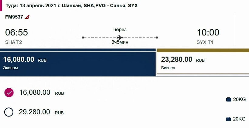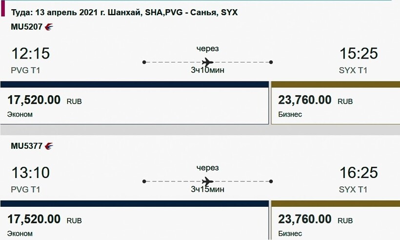 С China Eastern можно улететь по маршруту также трижды в день. Компания выполняет один утренний и два дневных рейса. Полет только туда с «Китайскими Восточными авиалиниями» стоит от 17500 ₽, если купить авиабилет и в обратном направлении, это обойдется от 35000 ₽ (в цену входит провоз 20 кг багажа). Бизнес-класс — примерно от 24000 ₽.