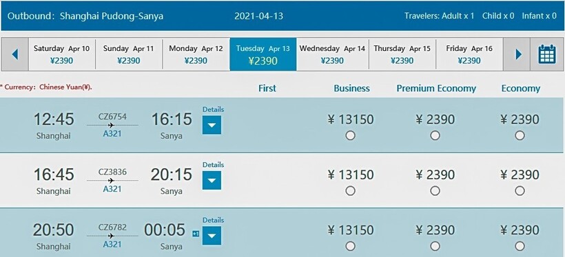 China Southern немного превосходит «Шанхайские авиалинии» по расписанию полетов, так как выполняет один дневной и два вечерних авиарейса (всего три в сутки). Но стоимость полета с «Китайскими Южными авиалиниями» выше, чем с упомянутой ранее компанией: путешествие туда с багажом обойдется от 27000 ₽ (2390 юаней), в обе стороны — от 55000 ₽ (4880 CNY). Бизнес-класс — от 148000 ₽ (13150 CNY).