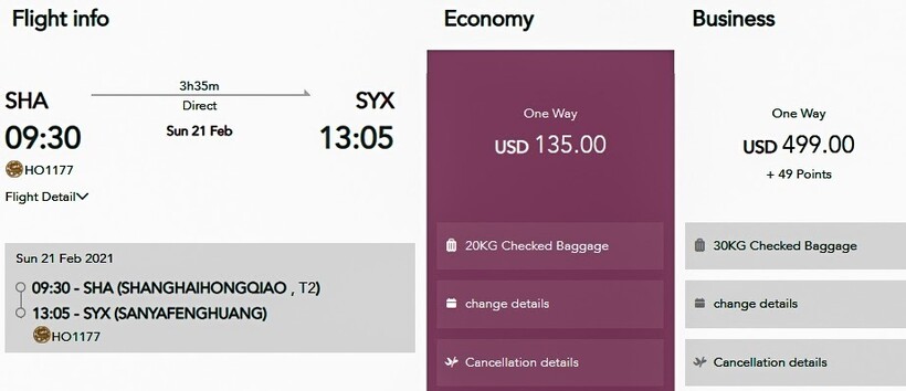 | Juneyao airlines (HO 1175) Airbus A320 NEO  | 16:35 Шанхай (PVG)  | 3 ч. 25 мин | 20:00 Санья (SYX)  | 14, 21 октября |