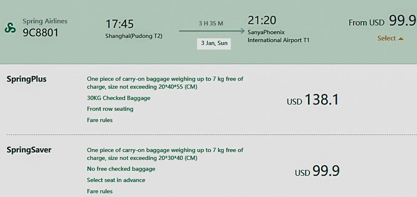 Со Spring Airlines можно улететь по маршруту каждый день утром и вечером (компания выполняет по два авиарейса). Билеты у данного лоукостера также дешевые: туда будут стоить с багажом в среднем 10500–11500 ₽ (138–157 $), в обе стороны — от 20500 ₽ (275 $). Полет предлагается только в экономклассе.