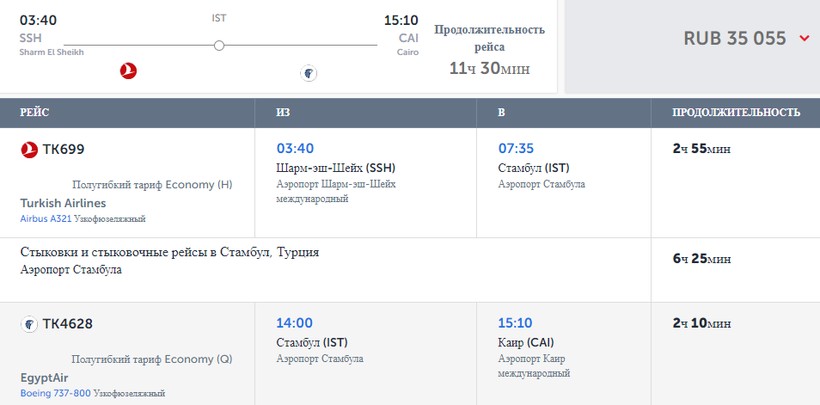 Выбирать стыковочные рейсы я не считаю целесообразным. Судите сами — самый оптимальный вариант предлагают Turkish Airlines и EgyptAir, он предусматривает пересадку в Стамбуле, которая занимает 6 часов и обеспечивается авиакомпанией, не нужно заново регистрироваться.