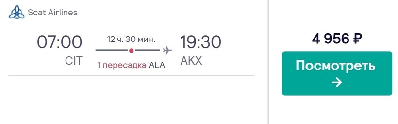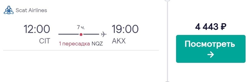 Также с авиакомпанией Scat Airlines можно добраться до места назначения с пересадкой в Алматы. Вариант вам подойдет, если у вас есть дела в этом городе, потому что пересадка здесь длительная — около 10 часов. Всего на дорогу уйдет 12,5 ч. Стоимость перелета за месяц и более — от 5000 рублей.