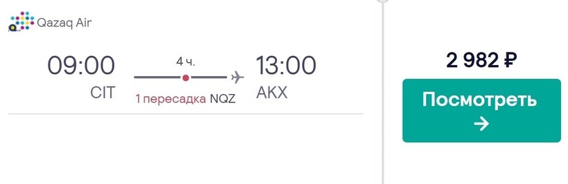 Самый быстрый транзитный перелет до Актобе предлагает авиакомпания Qazaq Air. Время в пути — 4 часа. Стыковка в Нурсултане — 1 час. Билеты за пару недель до авиапутешествия можно приобрести минимум за 3000 рублей. Обратный перелет с авиаоператором обойдется примерно в такую же сумму.