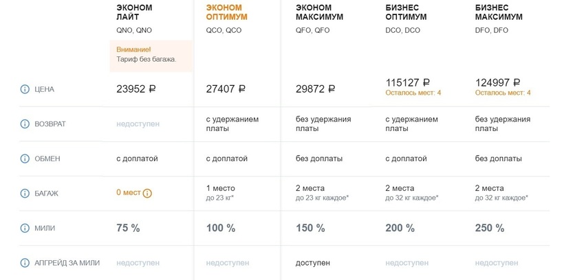 Багаж можно зарегистрировать до конечного пункта в аэропорту вылета. А/к предлагает только три тарифа в экономкласс. Бизнес-класса нет. Беру всегда тариф «Выгодный». Он включает: авиаперелет, провоз ручной клади размером до 36×30×27 см (по весу нет ограничений) и багажа (до 20 кг). Учтите, что «Победа» — лоукостер и бесплатное питание на борту не предоставляется.
