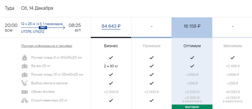 Минимальная стоимость полета составляет 21000 рублей, всего же предлагается несколько тарифов: