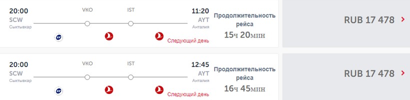 Не могу назвать его расписание удобным, однако компания предлагает одни из самых дешевых и быстрых вариантов добраться из Сыктывкара до Антальи. Самолеты летают по субботам и вторникам, весь путь займет 12,5 часа, 7 из которых придется провести в Москве (аэропорт Внуково).
