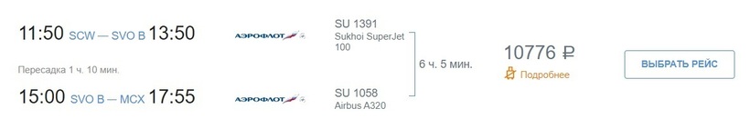 «Аэрофлот» летит с часовой стыковкой в Шереметьево. Общее время в пути — 6 часов. Не забывайте, что действует один билет, и регистрацию вы пройдете только в Сыктывкаре. В Шереметьево нужно показать проездной документ, и пройти в зону посадки. Ничего сложного.