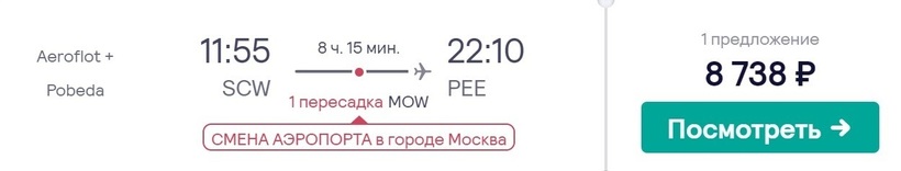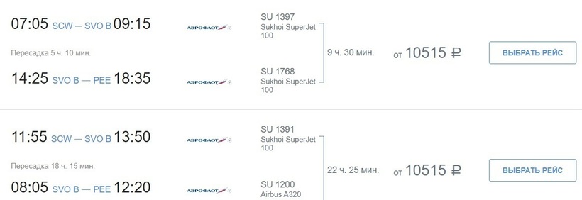 Прямое авиасообщение между Сыктывкаром и Пермью отсутствует. Придется лететь транзитом. Регулярные перелеты со стыковкой в Москве выполняет «Аэрофлот». Данную авиакомпанию часто выбирают по соотношению цены и качества. В ежедневном режиме доступно не менее десятка вариантов авиаперелетов. Пересадка всегда в Шереметьево, здесь у а/к даже есть свой терминал. Учитывая время стыковок, продолжительность рейсов составляет от восьми часов до суток с небольшим. Стартовый тариф у авиакомпании называется «Лайт» и подразумевает наличие только ручной клади (до 10 кг). Его стоимость — 10500 рублей. Не важно, бронируете билет за пару дней или месяцев до вылета. Цены стабильны. Исключение — праздничные дни. Если спрос на перелет высокий, то «Аэрофлот» может повысить цены на 10–15%.