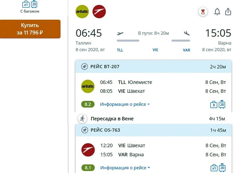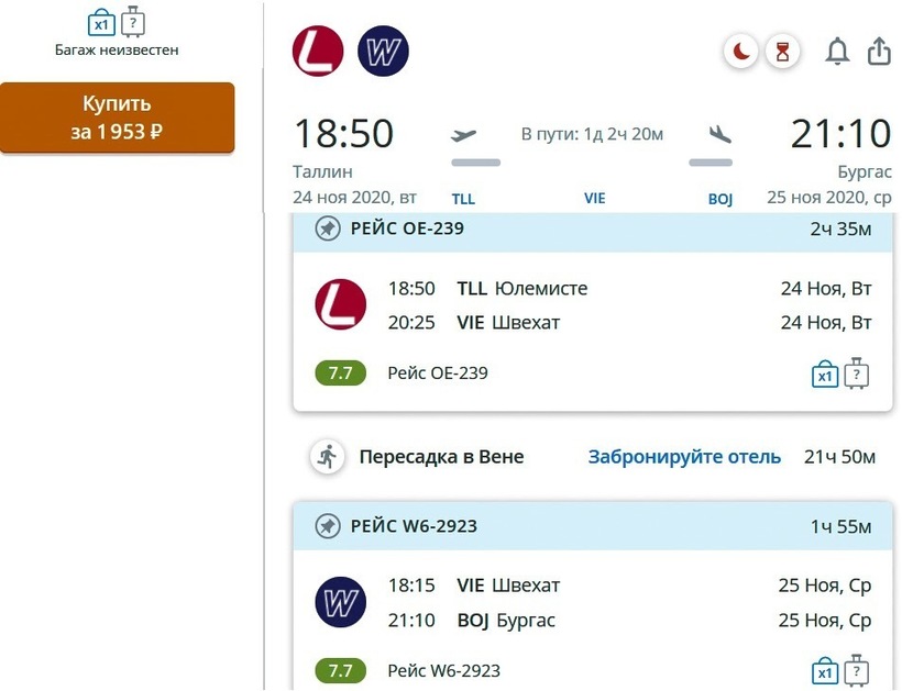 Неплохо развитым могу назвать авиасообщение между столицей Эстонии и Бургасом только в весенне-летний период (расскажу далее), а в осенне-зимнее время преодолеть путь с одной пересадкой (самостоятельной) получится только с бюджетными компаниями Laudamotion и Wizz Air. Самолеты лоукостеров летают по направлению дважды в неделю — по вторникам и субботам. Со стыковкой в Вене в 22 часа путешествие займет 26,5 ч. Основная часть пересадки приходится на ночное время, поэтому придется потратиться на проживание в отеле. Днем могу порекомендовать в австрийской столице, например, осмотреть дворец Шенбрунн или отправиться в Имперскую сокровищницу. К преимуществам данных операторов могу отнести дешевые авиабилеты с ручной кладью: туда стоят всего от 2000 ₽, в обе стороны — от 4000 ₽. Доплата за провоз багажа у лоукостеров высокая — составляет от 7500 ₽ в одну сторону. Бизнес-класс бюджетные авиакомпании не предлагают.