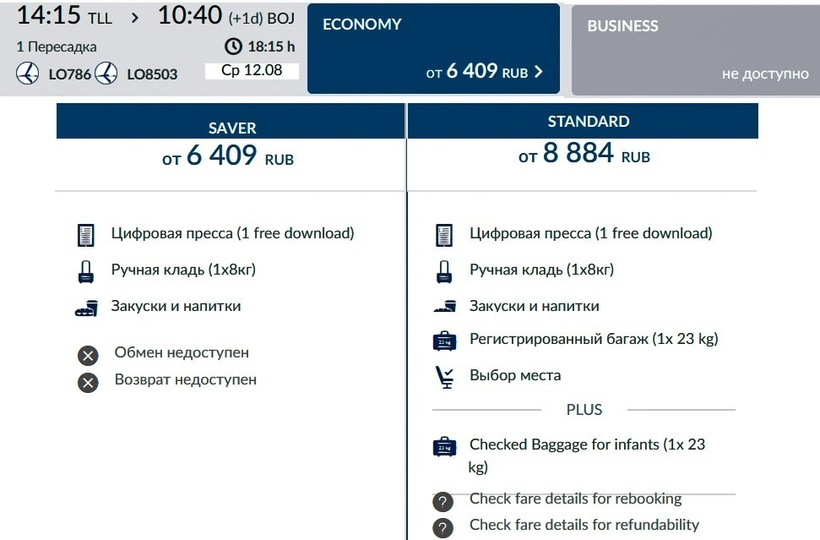 LOT уступает «Аэрофлоту» по расписанию рейсов и продолжительности полета: самолеты польской компании летают с июня по сентябрь по вторникам, средам, пятницам и воскресеньям, с ночной пересадкой в Варшаве в 12–16,5 ч. авиапутешествие длится 15,5–20,5 ч. Зато у польского авиаоператора есть существенное преимущество по стоимости билетов: туда с багажом обойдутся в 9000–11000 ₽, туда-обратно — от 19500 ₽. С ручной кладью полет дешевле на 2500 ₽. Бизнес-класс у LOT по направлению недоступен.