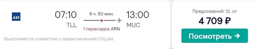 Также с этими же перевозчиками можно добраться до места и за 6 часов дневным рейсом. Пересадка в Копенгагене — 2 часа и 45 минут. Билеты туда-обратно за неделю до вылета купите за 10 тысяч руб. Путешествовать транзитом до Мюнхена получается минимум в 1,5 раза дешевле, чем прямым самолетом. Ради такой экономии я готова потратить на дорогу в 2,5 раза больше времени.
