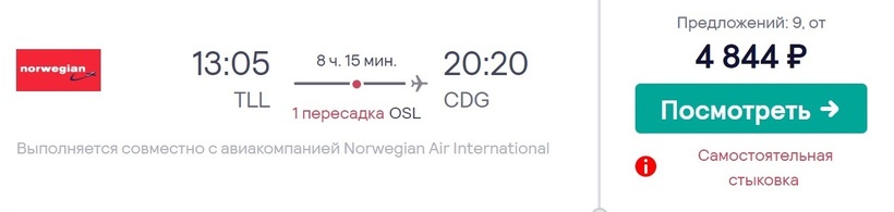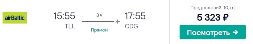 | Air Baltic (BT 861) Airbus A220-300 | 07:20 Таллин (TLL) | 3 ч. 00 мин | 09:20 Париж (CDG) | чт с 07.05 |