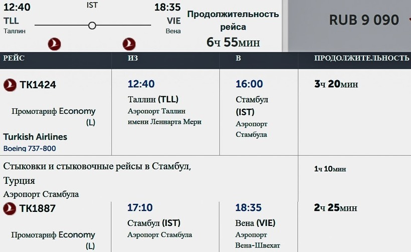 Air Baltic (BT 831) Airbus A220-300 | 10:45 Таллин (TLL) | 2 ч. 30 мин | 12:15 Вена (VIE) | пн с 30.03 |