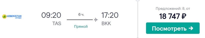 Прямые рейсы (2–4 раза в неделю в зависимости от времени года) по маршруту Ташкент — Бангкок осуществляет Uzbekistan Airways. Полетное время — 6 часов. Авиабилет за месяц до вылета можно купить за 18700 рублей. Обратный обойдется примерно в такую же сумму.